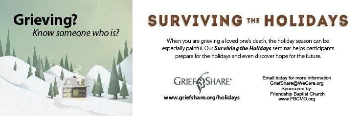 You will leave with a gift! A Survival Guide with helpful exercises for the days ahead. Be ready for what the holidays may bring and face them with a measure of peace and assurance.